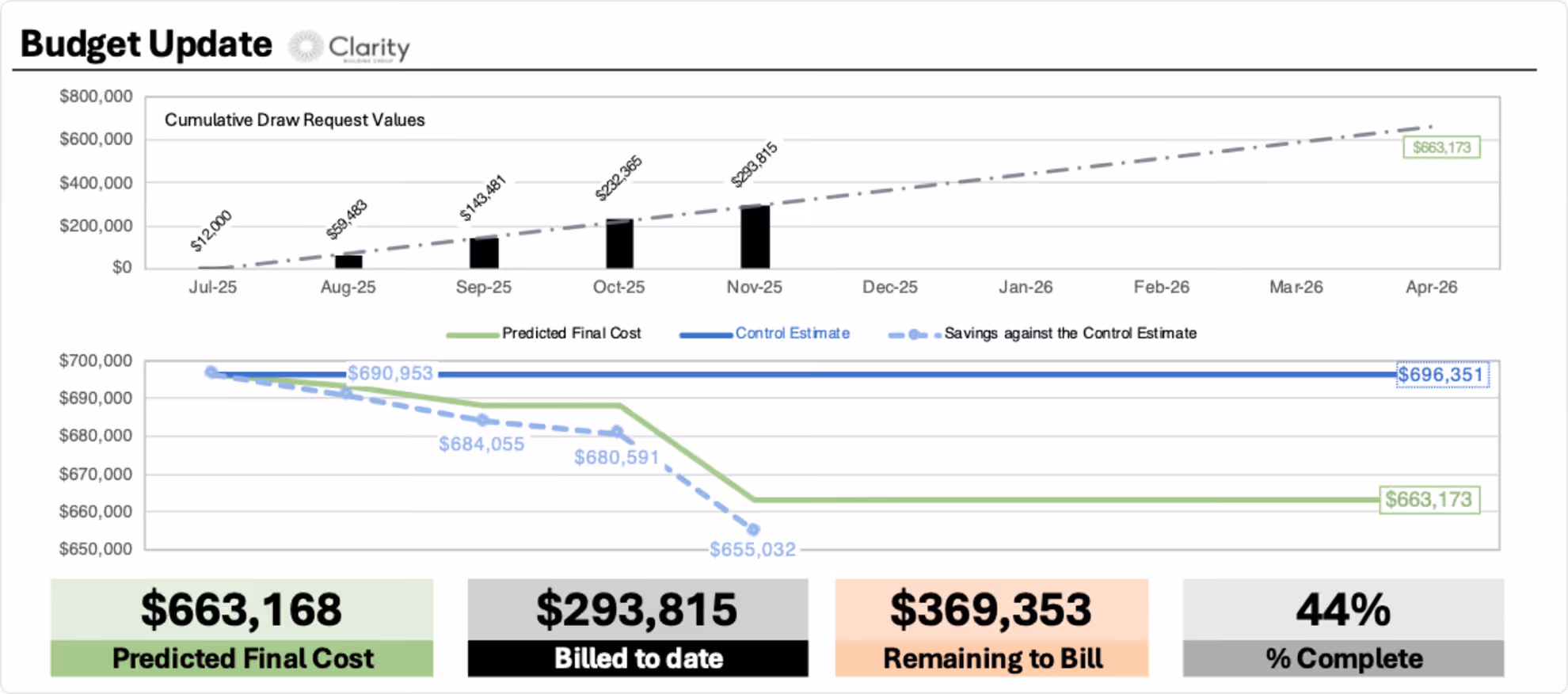 The Budget Update is the top-level snapshot clients see each month. It summarizes predicted final cost, billed-to-date amounts, remaining balance, and overall progress.