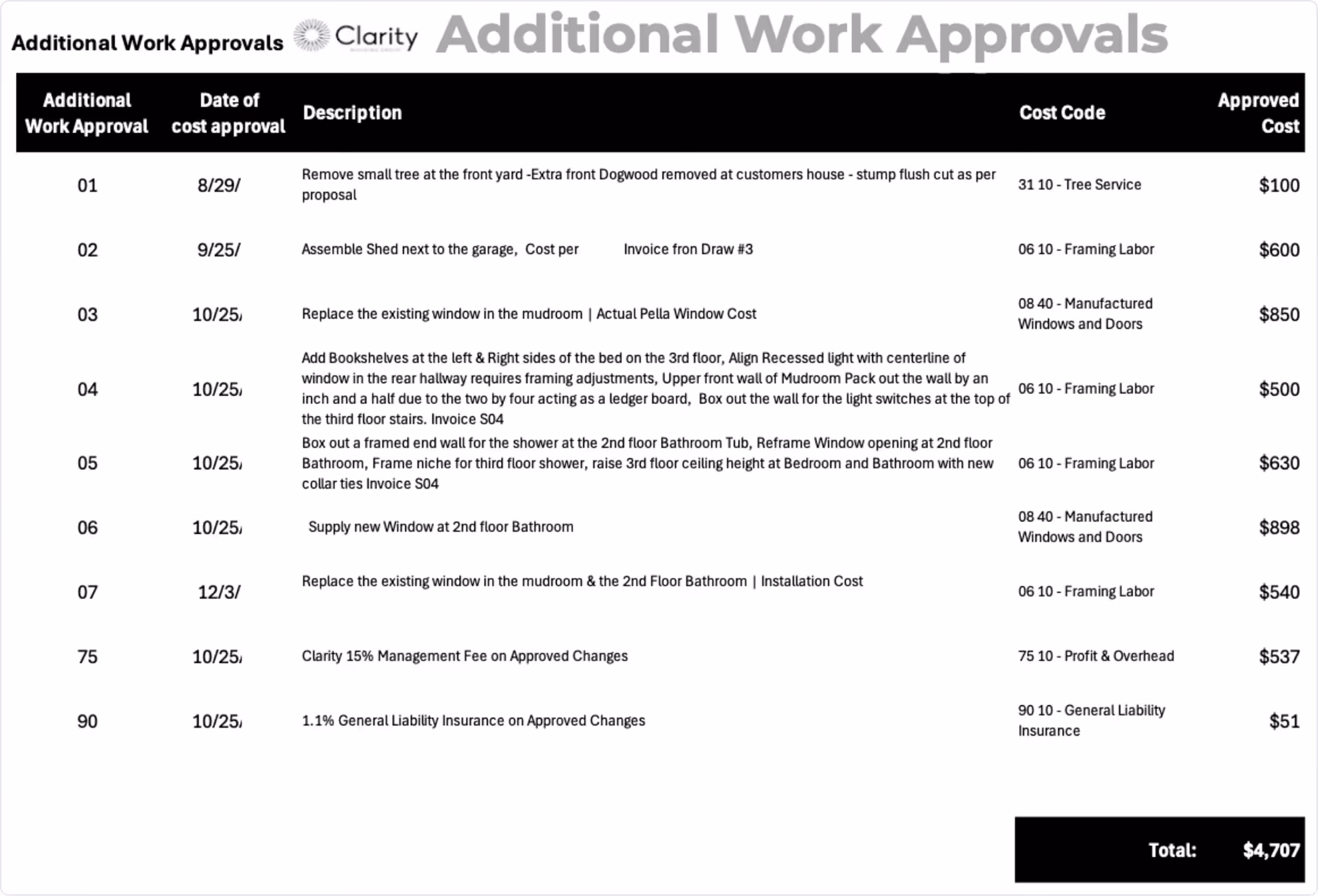 - Approved additional work that has been formally authorized